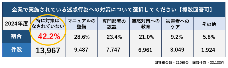 日本では、ある民間企業がサービス業に従事する組合員を対象におこなったアンケートによると、42.2%の企業でカスハラに対応する対策が特に取られていないことがわかりました。