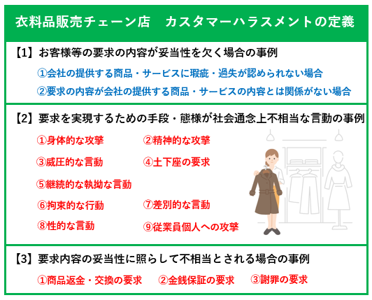 2024年8月、全国で2200店舗を展開する衣料品販売チェーン店は、従業員が安心して働くことができるようカスハラへの対応マニュアルを制定し、職場環境を整えるとしました。この衣料販売店では2013年に客が従業員に土下座を要求し、映像をSNSに流すという事件が起こっています。