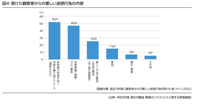 以下の表は、厚生労働省が令和2年に行った調査で、全国の企業、団体に勤務する20~64歳の男女労働者のうち、過去3年間に勤務先でカスハラ行為を受けた内容の割合を示したグラフです。