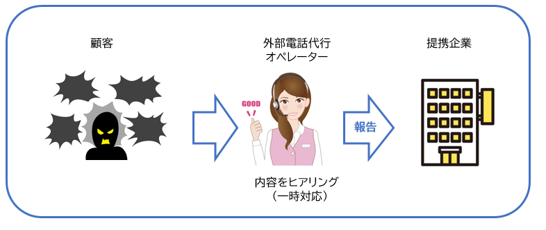 特にクレームは最初の温度感が一番高いことが多いです。こういったクレームの対応は、一時受付を外部の相談窓口を利用し、顧客の温度感が落ち着いた状態で社内従業員が対応することで、従業員のメンタルヘルスの安定に繋がり善管注意義務を遵守することに繋がります。