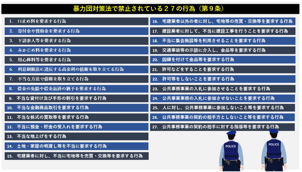 暴力団対策法(暴対法)第9条では、暴力団員に対して27項目の禁止行為が定められています。