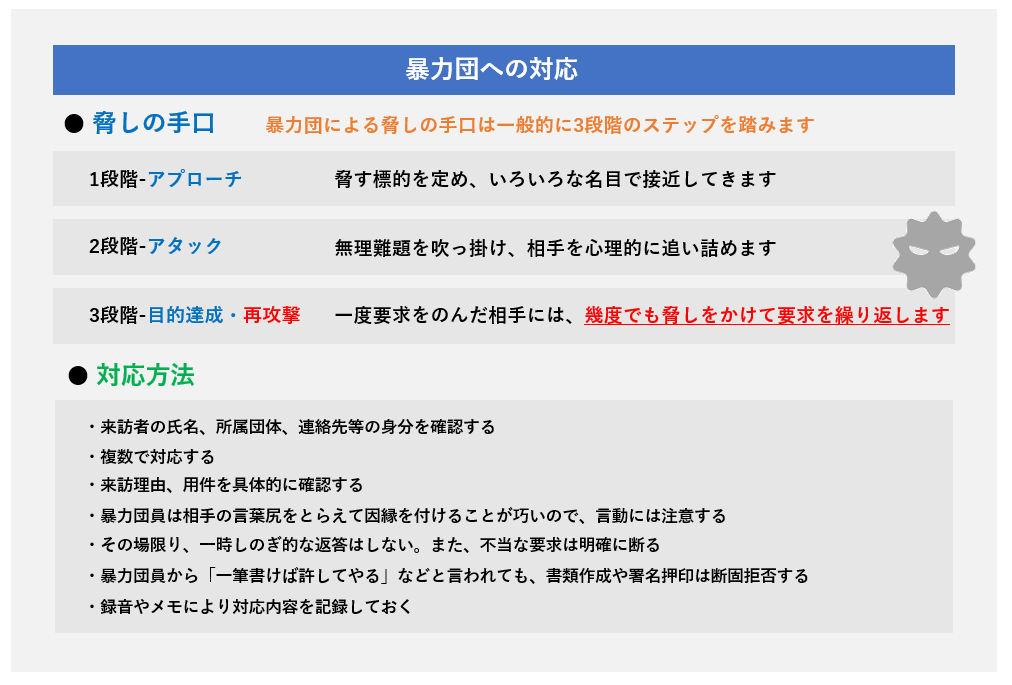 こうした被害を未然に防ぐためには、カスハラ対策を進めるだけでなく、不当要求と正当なクレームの違いを理解し、さらに暴力団対策法(暴対法)に関する基礎知識を身につけておくことが重要です。