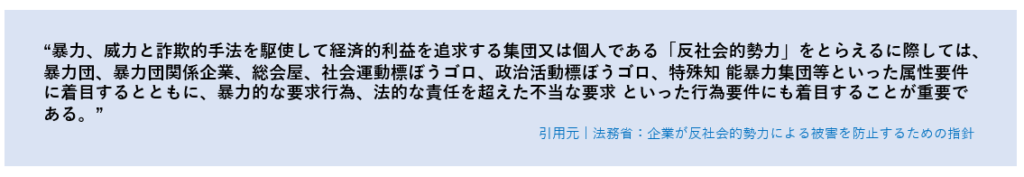 政府が示す「企業が反社会的勢力による被害を防止するための指針について」によると、反社会的勢力とは「暴力、威力と詐欺的手法を駆使して経済的利益を追求する集団又は個人」とあります。