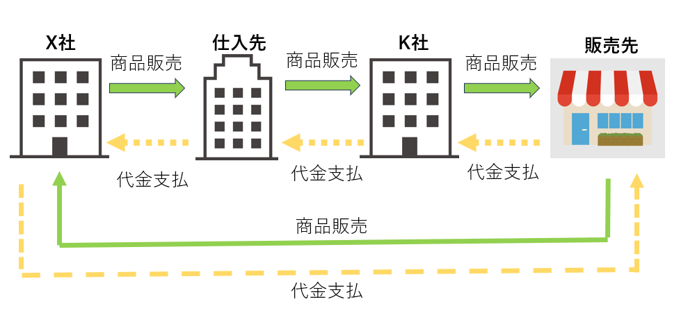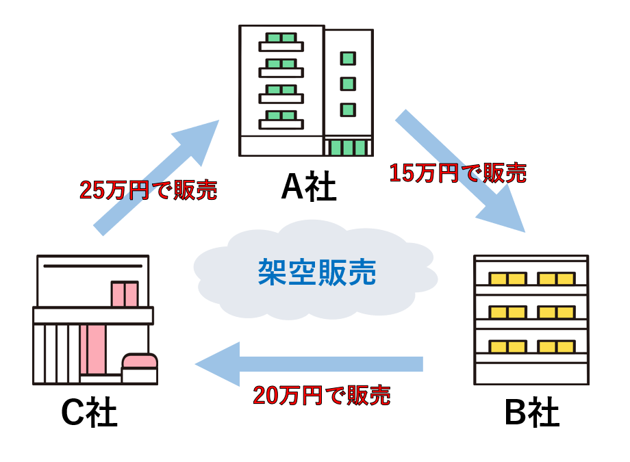 実際に売買はせずに、同様の取引を複数回繰り返し3社間で伝票のみを回す架空販売が行われます。