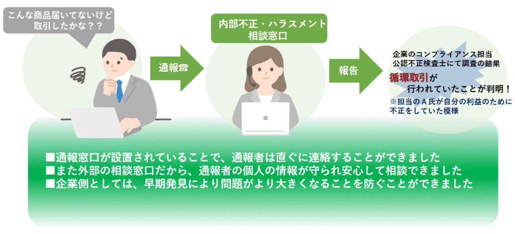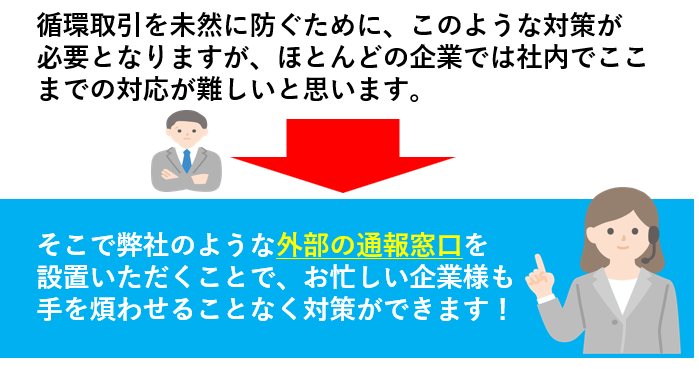 こうした複雑な状況に立ち向かうために、「社外通報窓口」(ハラスメント相談窓口、循環取引など社内不正相談窓口)の設置が必要です。社外通報窓口は、組織内の従業員がいつでも安心して相談できる独立した窓口です。