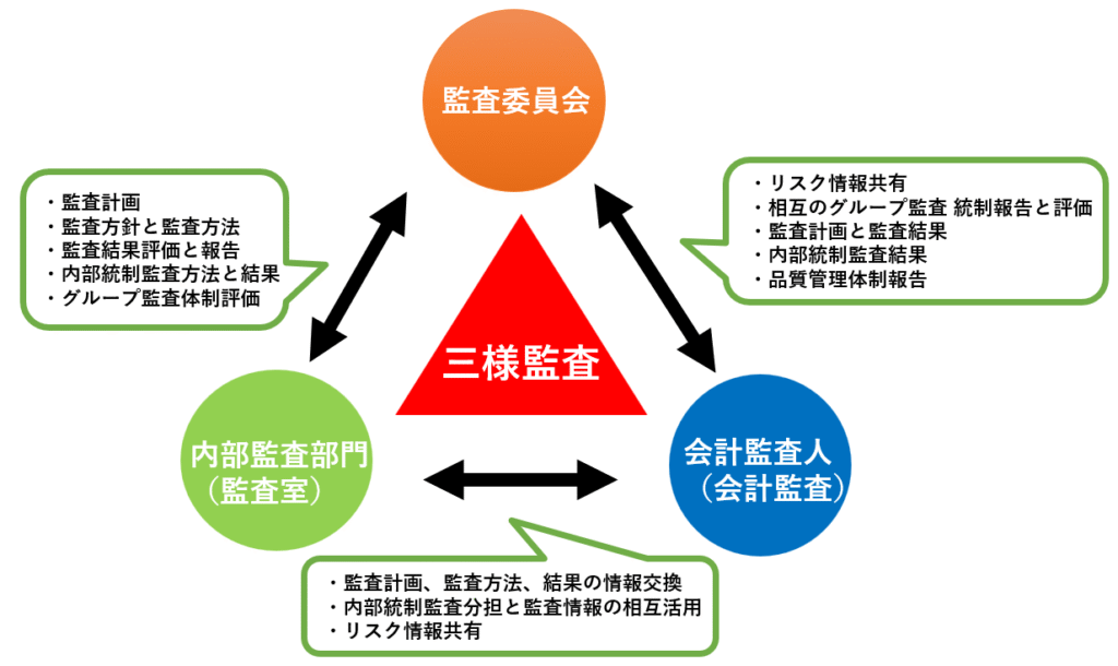 内部不正を未然に防ぐために、三様監査と呼ばれる「会計監査人監査」、「監査役監査」、「内部監査」の3つの監査も重要です。