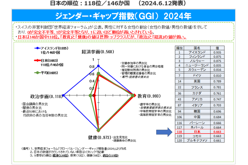 この「ジェンダーギャップ指数」が低いほど男性優位の社会であり、女性はその性別を理由として不当な差別を受けていることを意味しますので、日本は明らかに「ジェンダー後進国」の状況にあるといえます。