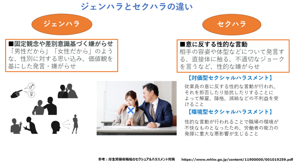 セクシャルハラスメント(セクハラ)とは、相手の容姿や体型などに関する発言をしたり、直接体に触ったりなど、性的な嫌がらせのことを指します。一方、ジェンダーハラスメント(ジェンハラ)は、「男性なんだから」「女性なんだから」といった、性別に対する思い込み・価値観を原因とする嫌がらせ・言動を指します。