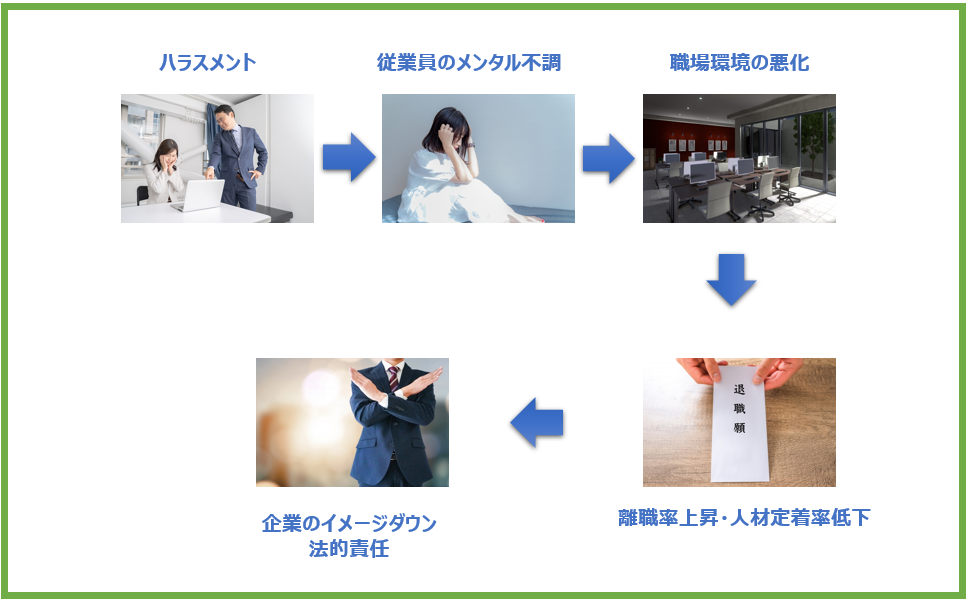 ハラスメントが発生した場合、法的責任のみでなく、生産性の低下や退職者の増加、企業イメージの低下など、会社の経営を揺るがす事態になりかねません。