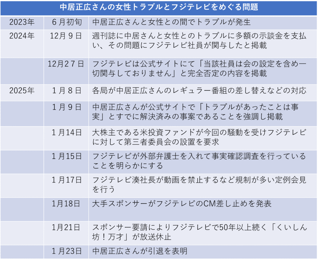 今回の騒動で、中居正広さんは「私、中居正広は本日をもって芸能活動を引退いたします。これで、あらゆる責任を果たしたとは全く思っておりません。今後も、様々な問題に対して真摯に向き合い、誠意をもって対応して参ります。全責任は私個人にあります。改めて、相手さまに対して心より謝罪申し上げます」などと公式ファンクラブサイトで公表し37年にわたる芸能生活の引退を表明しました。