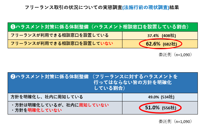 公正取引委員会および厚生労働省は、この「フリーランス新法」の施行に向けて、令和6年5月から6月にかけて「フリーランス取引の状況についての実態調査(法施行前の状況調査)」を行っています。それによると、ハラスメント対策に係る体制の整備があまり整えられていないことがわかりました。