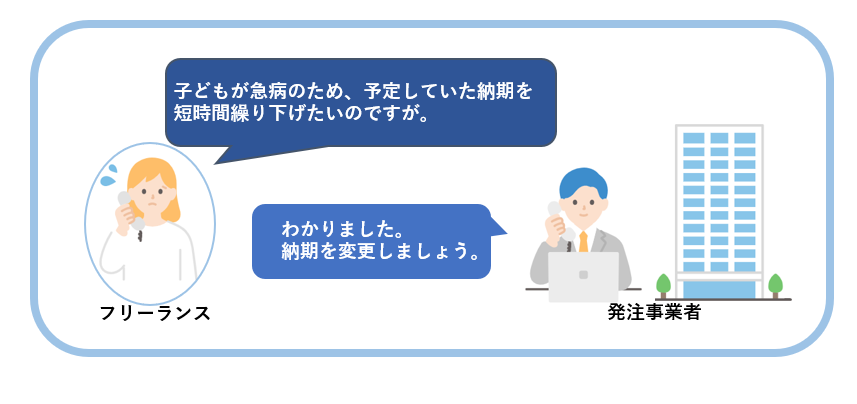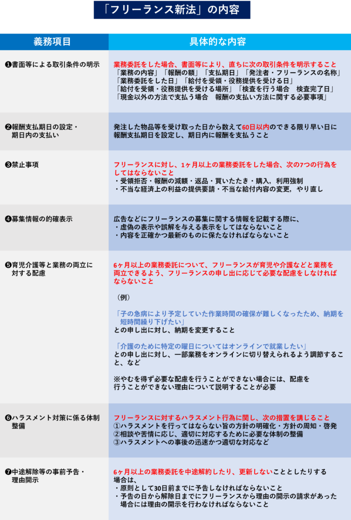 この新法はフリーランスが安心して働くことができる労働環境の整備を整えることにあります。例えば、発注事業者は、6ヶ月以上の業務委託についてフリーランスが育児や介護などと業務を両立できるよう申し出に応じて必要な配慮をしなければなりません。フリーランスにとって、仕事との両立が図りやすくなり安心して働ける体制が整います。