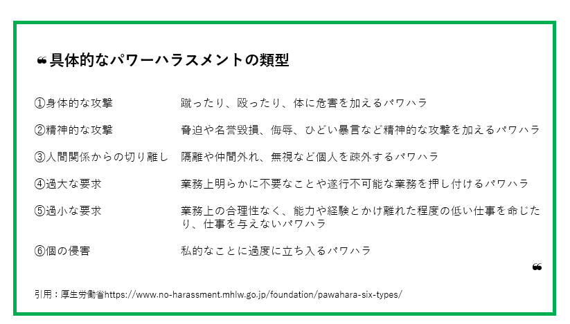 厚生労働省ではパワーハラスメントとの定義として、以下のように記しています。