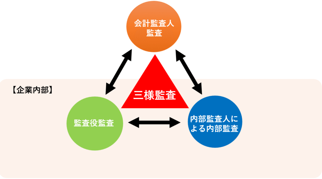 内部不正を未然に防ぐために、三様監査と呼ばれる【会計監査人監査】、【監査役監査】、【内部監査人による内部監査】の3つの監査体制が重要です。