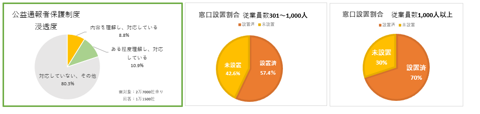 労働者が300人を超え、通報窓口の設置が義務付けされている企業だけに着目してみても「従業員数301~1000人で57.4%」「従業員数1000人超で70%」と対応が進んでいないことがわかります。