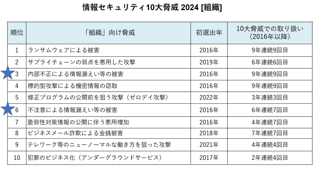 「内部不正による情報漏えい等の被害」は、2022年5位⇒2023年4位⇒2024年3位と年々ランキングが上昇しており、「不注意による情報漏えい等などの被害」もまた、2022年10位⇒2023年9位⇒2024年6位と上昇傾向にあります。