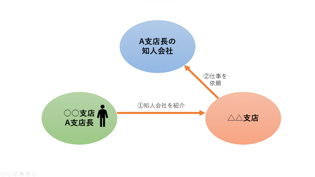 先日、A支店長の統括する○○支店とは別の支店(△△支店)に、急な仕事が入り作業員が不足し対応に困っていたところ、A支店長から知り合いの会社を紹介され、△△支店では、その会社に仕事を依頼しました。