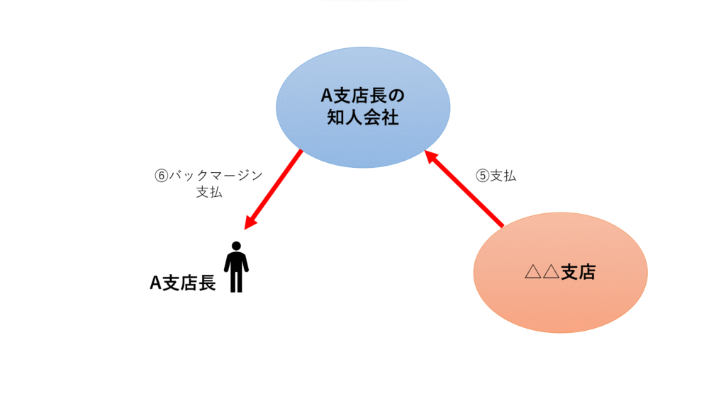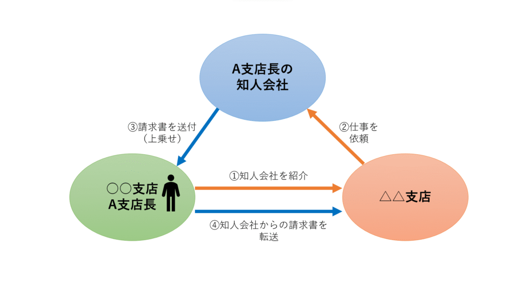 その後、A支店長の知人会社からは、該当する仕事の請求書が○○支店に送られ、A支店長のはその請求書を△△支店に送り、△△支店からA支店長の知人会社に支払いが行われました。