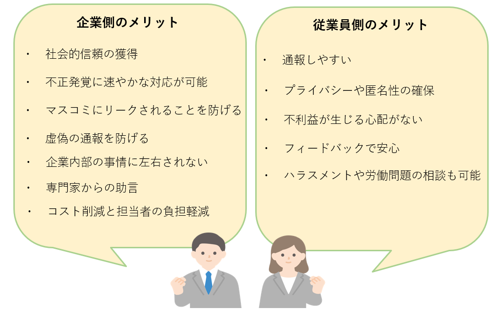 3つめは、悪意を持った窓口の不正利用を防げるという点です。外部通報窓口は第三者機関のため社内の誰かを陥れようとする虚偽の通報をしても公正に判断することができます。