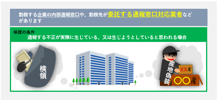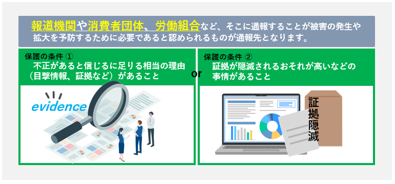 保護の条件としては、①不正があると信じるに足りる相当の理由(目撃情報、証拠など)があること、又は②不正があると思い、かつ、氏名などを記載して提出することです。