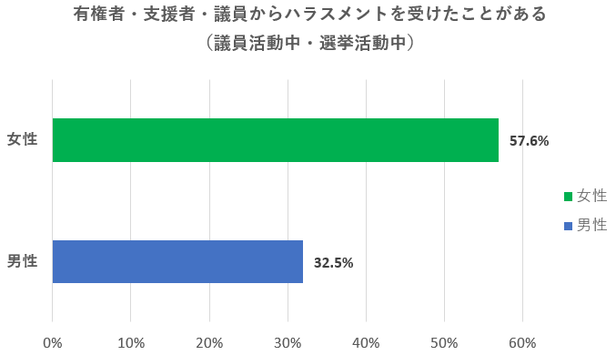 内閣府男女共同参画局が、地方議員を対象に行った「政治参画を阻む要因」を調査した結果が令和2年に発表されています。それによると、議員活動や選挙活動中に有権者や支援者・議員からハラスメントを受けたことがあるかとの質問に対して、全体の42.3%、男性の32.5%、女性の57.6%がいずれかのハラスメント行為を受けたと回答しています。