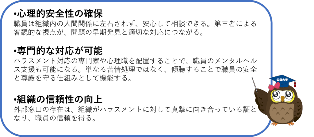 こうした複雑な状況に立ち向かうために、「社外通報窓口」(ハラスメント相談窓口、循環取引など社内不正相談窓口)の設置が必要です。社外通報窓口は、組織内の従業員がいつでも安心して相談できる独立した窓口です。