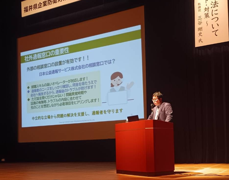 この度、日本公益通報サービス株式会社 取締役 三谷 剛史は、福井県企業防衛対策協議会様からのご依頼を受け、2025年5月13日に『公益通報者保護法について ~改定のポイント・対策~ 』と題してセミナーを実施致しました。