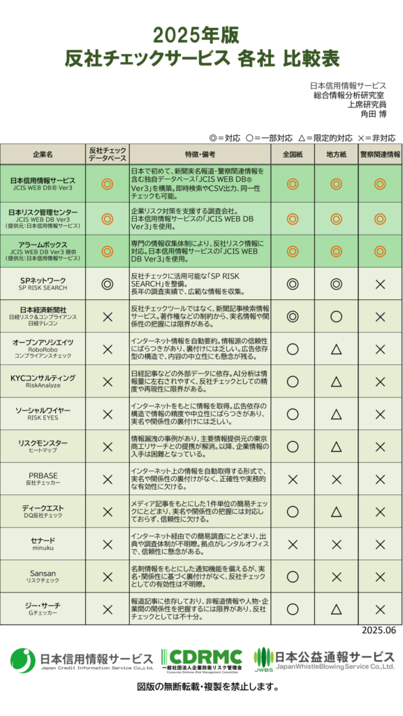 ・わかりやすい「反社チェック 主要14社比較表」も掲載